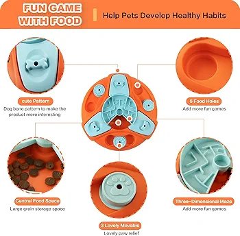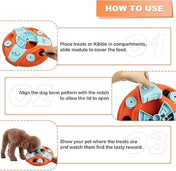 Level 4 Difficulty Interactive Dog Educational Toy This is an upgraded version of the interactive educational toy, with 3 sliders around the toy, a slow food tray in the middle and 3 dog bone covers. Guide the dog to turn the slow food tray to align the gap to open the dog bone cover to get the food reward. This difficult for dogs helps pets improve their IQ by learning sequential steps and challenging games